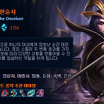 챔프 설명 및 템트리 챔프 능력치 챔프 스킬 챔프 스토리 한 때 아이오니아의 전도유망한 마법사였던 리 신은, 무고한 목숨을 앗아갔던 끔찍한 실수를 만회하기 위해 쇼진 사원에서 속죄의 길을 걸어온 눈 먼 수도승이다. 녹서스 침공이 한창이던 때, 리 신은 힘과 육체의 합일을 누구도 상상하지 못한 수준으로 이뤄냈다. 이제 그는 불타는 주먹과 초인적인 위력의 발차기로 감히 모국을 더럽히는 자들에 맞서 싸운다. 단편소설 해 묵은 뿌리와 구불구불한 고목, 바위 위에 우거진 덩굴이 가득한 정글 속엔 길조차 제대로 나있지 않았다. 부에 대한 단꿈과 탐욕으로 부푼 가슴을 안고 세 사내가 땀을 뻘뻘 흘리며 풀숲을 헤치고 있었다. 엿새 동안 험한 정글을 헤맨 끝에 드디어 사원이 덤불 위로 모습을 드러내고 있었다. 거대 암석..
